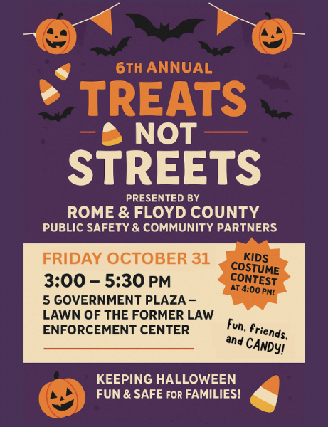 It's baaack! Treats Not Streets trick-or-treating event hosted by our public safety and community partners will be held on Friday, October 31, 2025, from 3:00 p.m. to 5:30 p.m. on the lawn of the former Law Enforcement Center located at 5 Government Plaza, Rome. As usual, this event will coincide with Downtown Rome trick-or-treating on Broad Street, so don't forget to stop by! The kids costume contest begins at 4:00 p.m. Come join the fun!