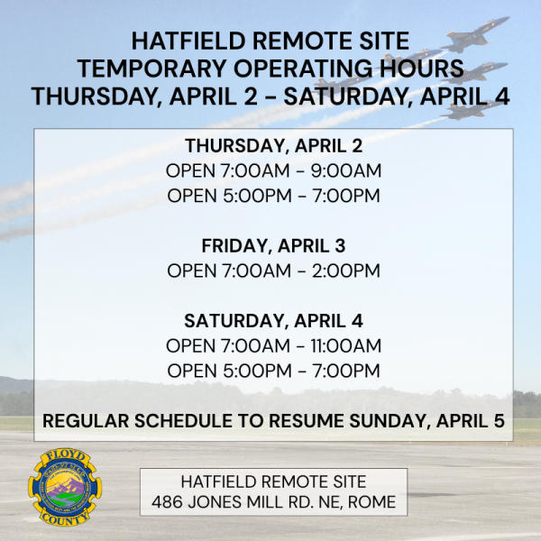 Please note temporary operating hours are in place for the Hatfield remote site located at 486 Jones Mill Rd. NE, Rome, during the Wings Over North Georgia Airshow. Regular hours will resume on Sunday, April 5.